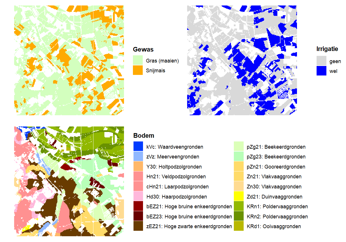 Als voorbeeld beschouwen we een gebied binnen het stroomgebied van De Raam (fictief). Voor dit gebied maken we een inschatting maken van de opbrengstderving over de periode 2016 - 2020. Gegevens over landgebruik en bodemtype zijn afkomstig van een regionale modelberekening. Het landgebruik in het interessegebied bestaat uit grasland en snijmais waarbij op veel percelen irrigatie is toegestaan. Het bodemtype is gebaseerd op de Bodemkaart van Nederland, zie Figuur 6.1. De door het regionale model gesimuleerde freatische grondwaterstand wordt gebruikt als onderrandvoorwaarde voor het SWAP-WOFOST modelinstrumentarium. Voor de simulatie periode zijn de freatische grondwaterstanden weggeschreven om de 14 dagen. We gebruiken de meteorologische condities van het weerstation Volkel die we genereren volgens de procedure beschreven in Bijlage B.