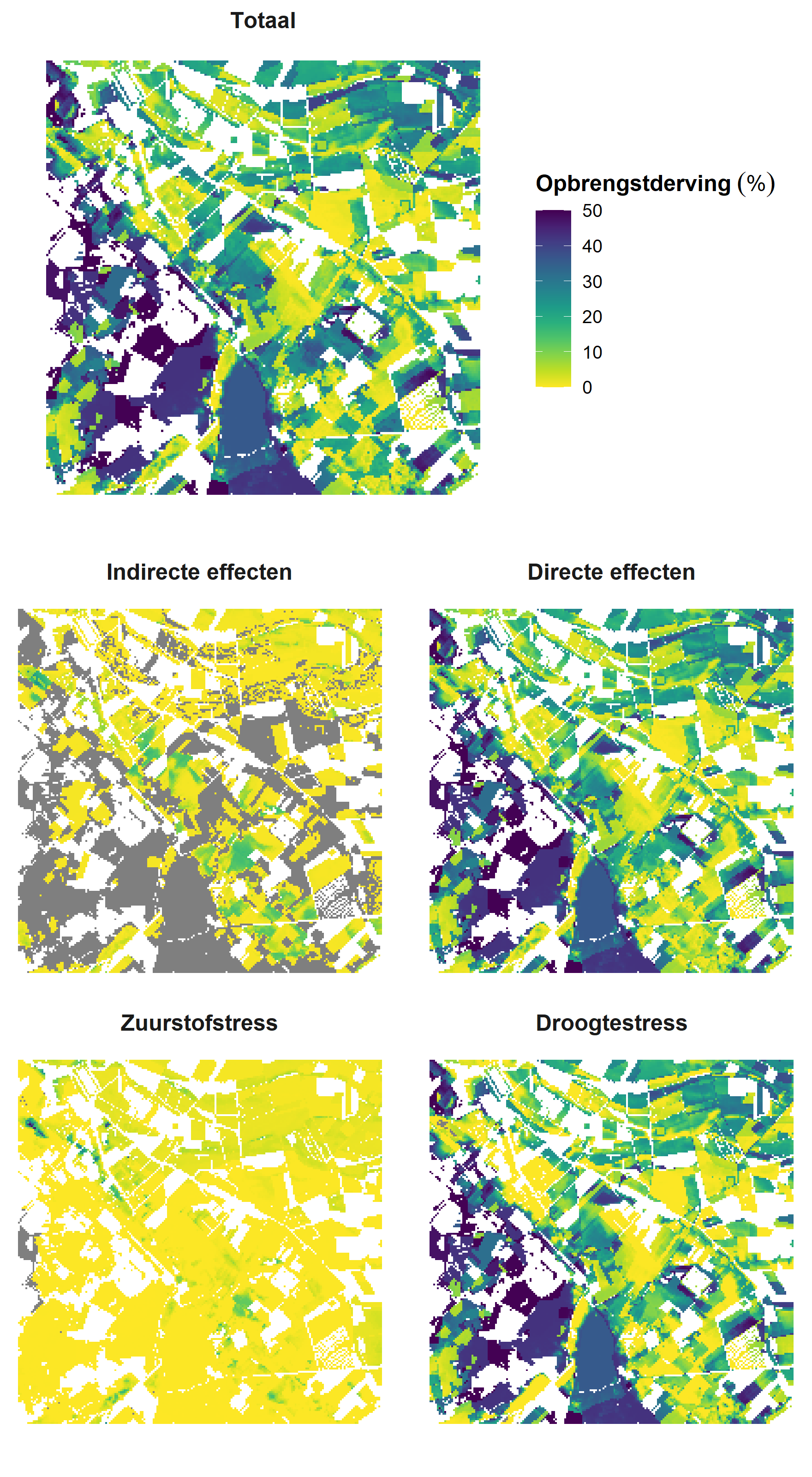 Als eindresultaat zijn kaartlagen met de potentiële gewasopbrengst en per schadecomponent gecreëerd. Figuur 6.2 geeft de gemiddelde opbrengstderving weer voor de periode 2016-2020.